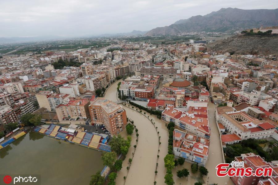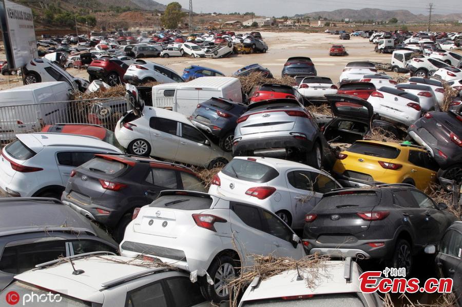 Cars submerged in water after the strong rainfall known as the "gota fria" (cold drop) hit Orihuela, Alicante in Spain. (Photo/IC)