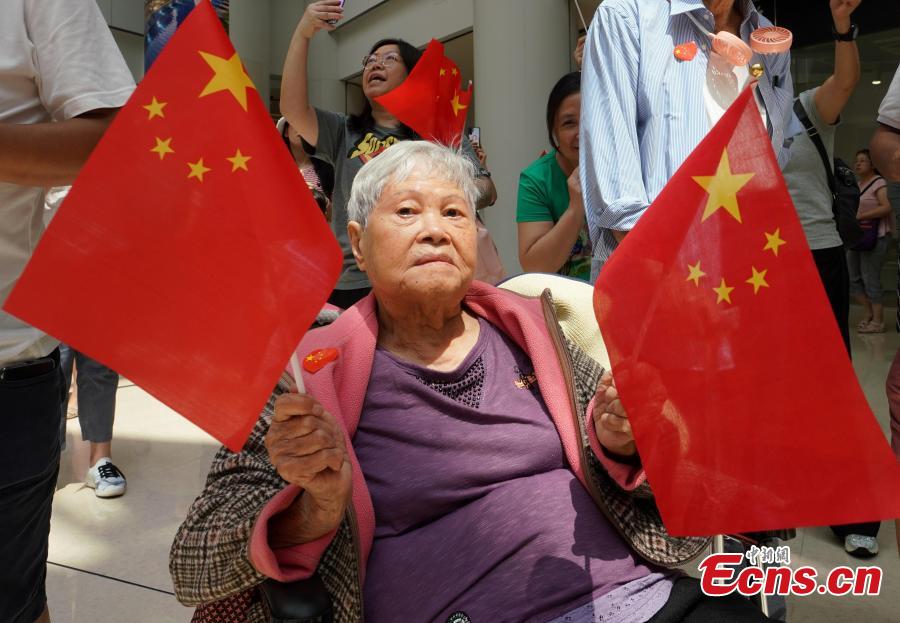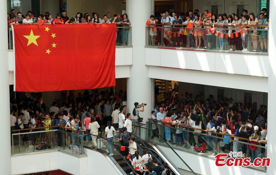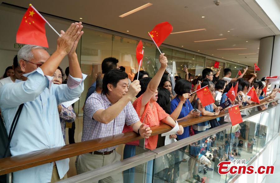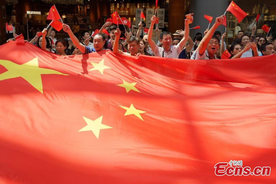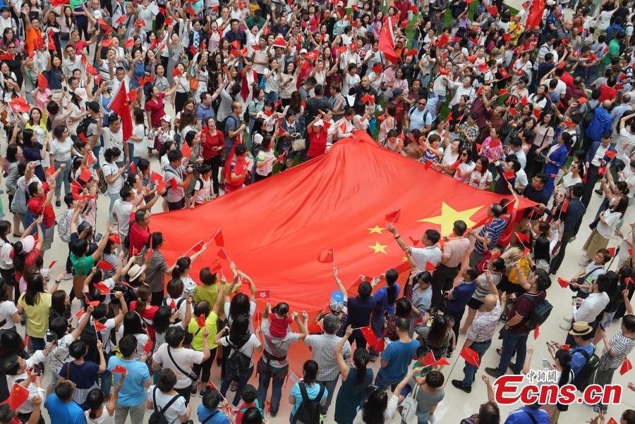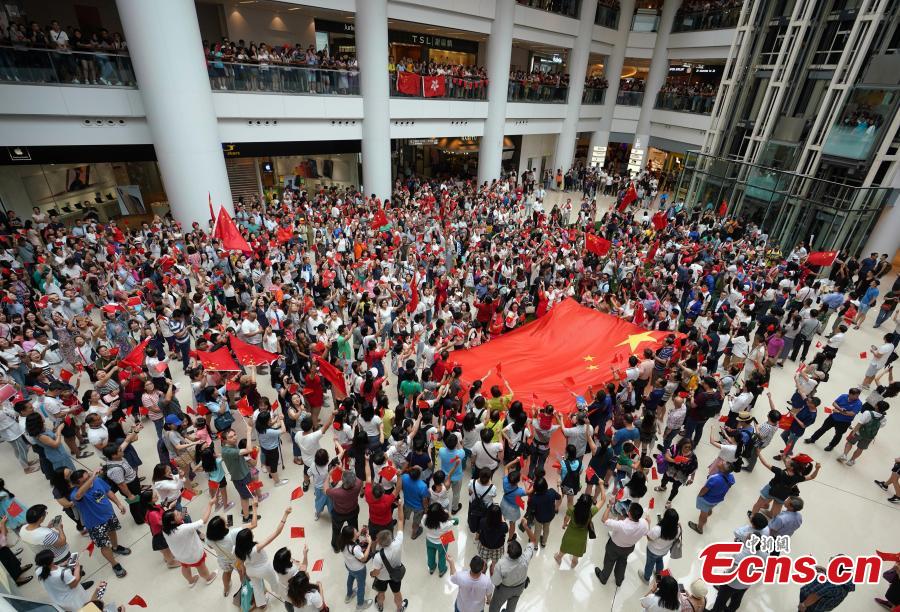People attend a flash mob at Olympian City 2, a shopping complex in Hong Kong, Sept. 13, 2019. Participants waved national flags and sang China’s national anthem during the event. (Photo: China News Service/Zhang Wei)
