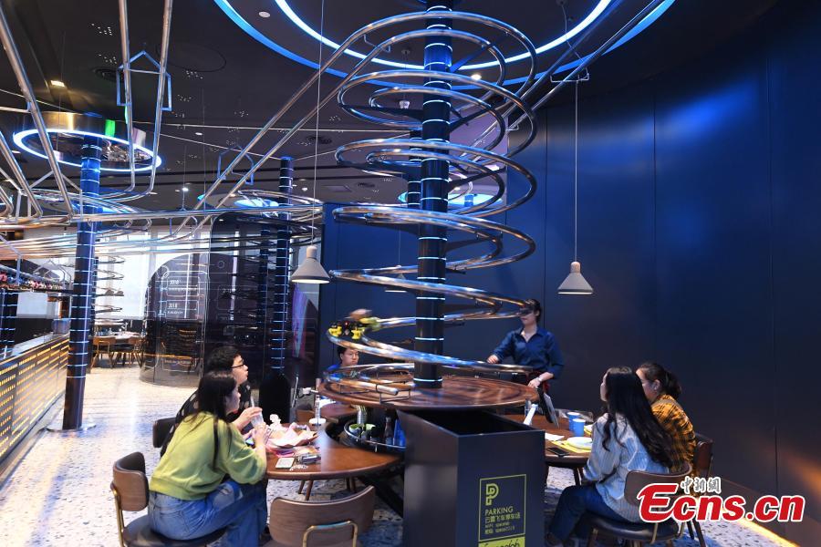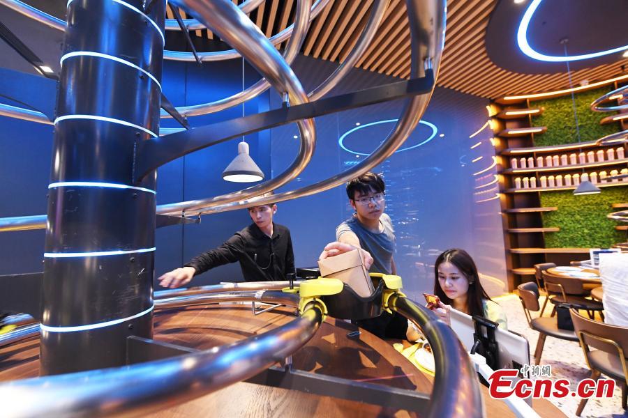 Food is delivered to diners by way of gravity-powered rollercoaster tracks at a restaurant at the Raffles City shopping mall in Chongqing, Sept. 16, 2019. Robots also serve food to tables, and the unique delivery methods have attracted many customers. (Photo: China News Service/Chen Chao)