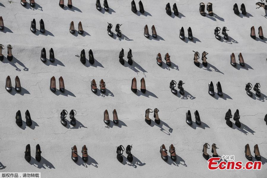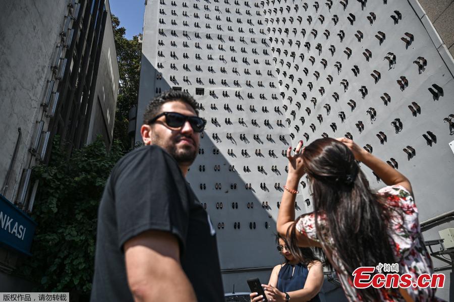 High heels are installed on a facade of a building in downtown Istanbul, Turkey, Sept. 17, 2019. A total of 440 pairs of high-heel black shoes were installed recently on a facade of a building in downtown Istanbul to draw attention to the equal number of women murders in Turkey last year and raise awareness against increasing male violence in the country. (Photo/Agencies)