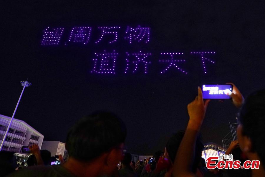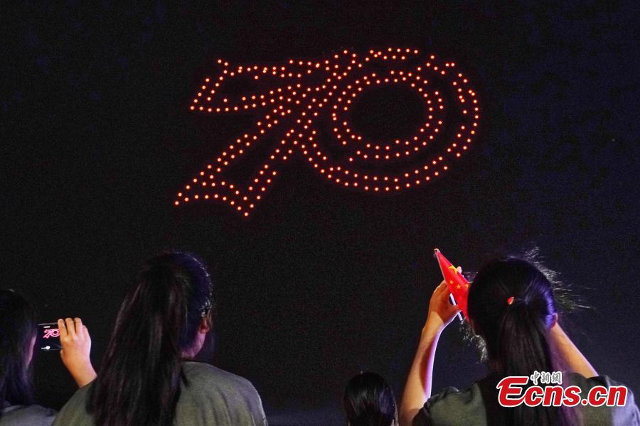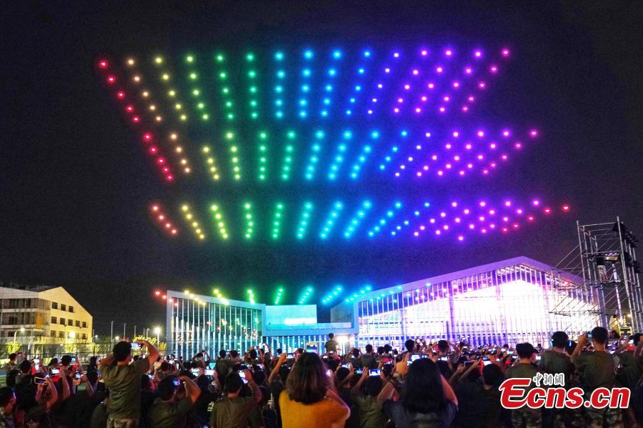 Photo taken on Sept. 17, 2019 shows a drone display at the Tianmu Lake Campus of Nanjing University of Aeronautics and Astronautics in Nanjing, Jiangsu Province as part of celebrations to mark the 70th anniversary of the founding of the People’s Republic of China. As music played, 300 drones took off to form Chinese characters such as Love China or iconic patterns including Tiananmen. (Photo: China News Service/Yang Bo)