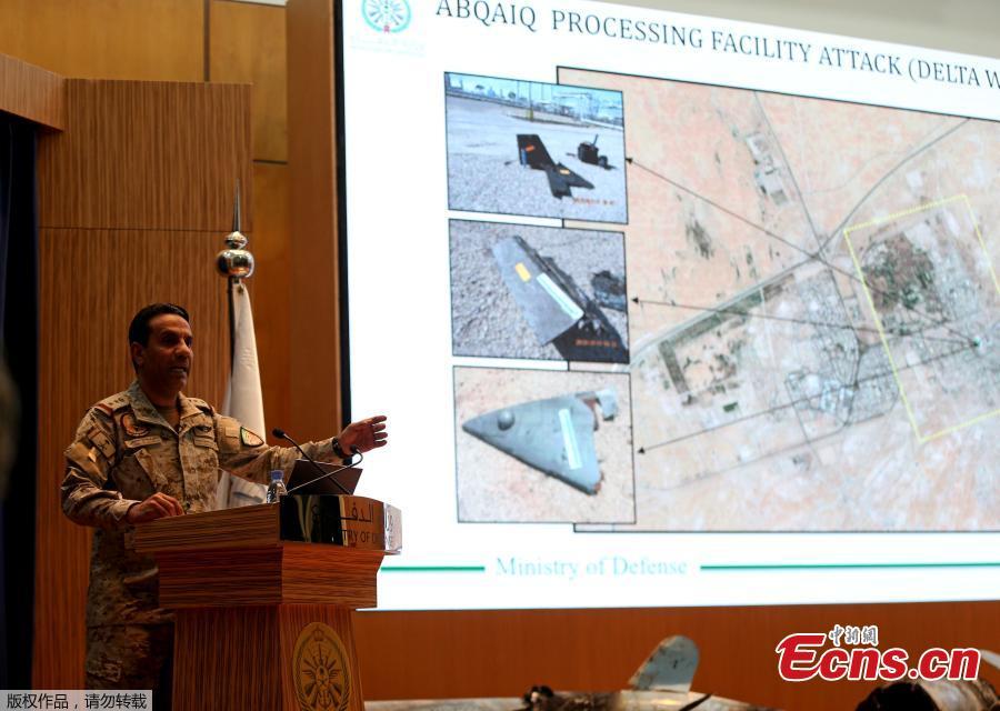 Saudi defence ministry spokesman Colonel Turki Al-Malik displays on a screen drones which Saudi government says attacked an Aramco oil facility, during a news conference in Riyadh, Saudi Arabia September 18, 2019. (Photo/Agencies)