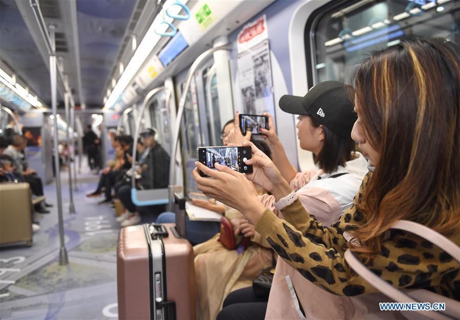People travel in a subway train, which is turned into a temporary museum to celebrate the upcoming National Day in Chengdu, southwest China's Sichuan Province, Sept. 18, 2019. More than 300 historic photos and pictures of historic items were on display in the museum set up in a subway train, showcasing the great changes in China, especially in Sichuan Province and Chengdu City, over the past 70 years. (Xinhua/Liu Kun)