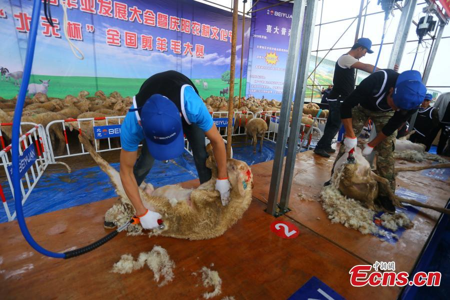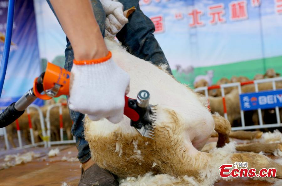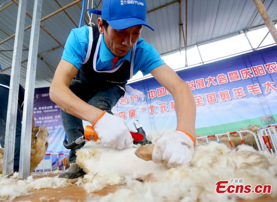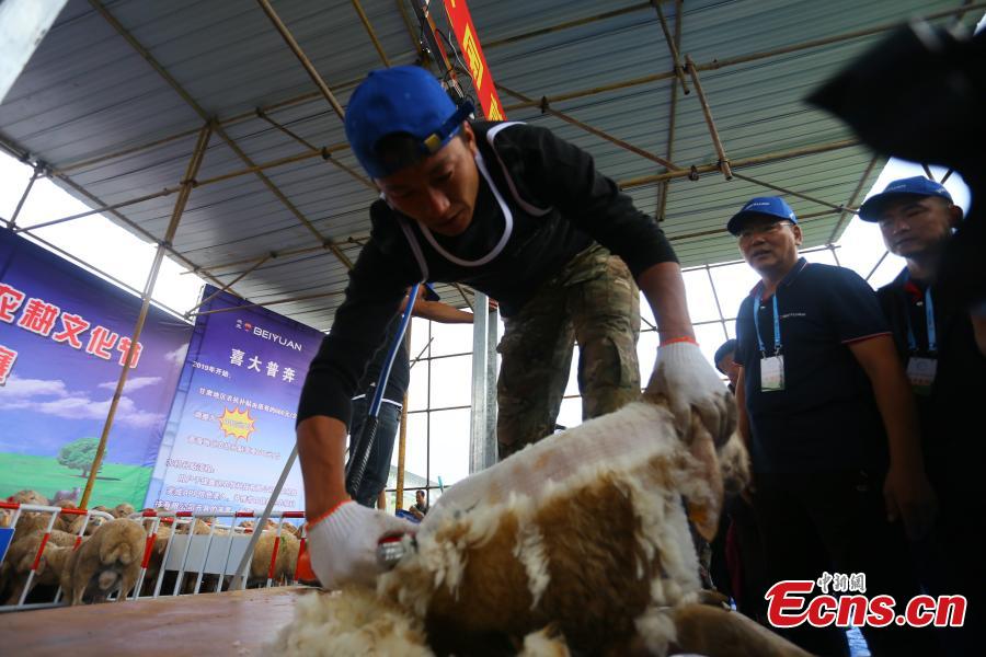 A sheep shearing contest was held in Qingyang City, Northwest China’s Gansu Province from Sept. 17 to 19, 2019. Part of the 16th China Sheep Industry Development Conference, the contest attracted 32 participants, including four women, from many regions of the country. (Photo: China News Service/Gao Zhan)
