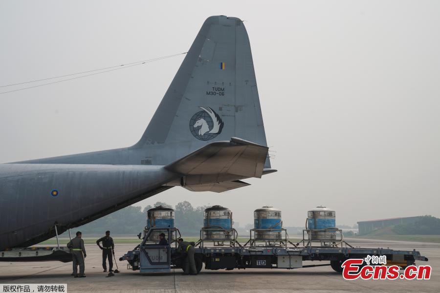 Tanks containing a solution of water and salt loading them into a military plane at Subang Military airbase in Subang, Malaysia, Thursday, Sept. 19, 2019. Malaysian authorities plan to conduct a cloud-seeding operation to induce rain in an effort to ease the haze problem due to forest fires in neighboring Indonesia. (Photo/Agencies)