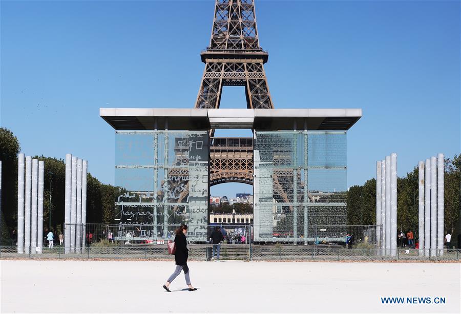Photo taken on Sept. 19, 2019 shows columns of the Wall for Peace beside Eiffel Tower in Paris, France. The word "PEACE" is engraved on it in 32 languages. (Xinhua/Gao Jing)