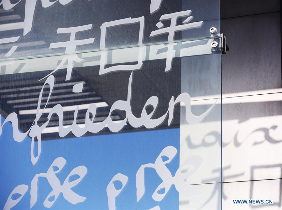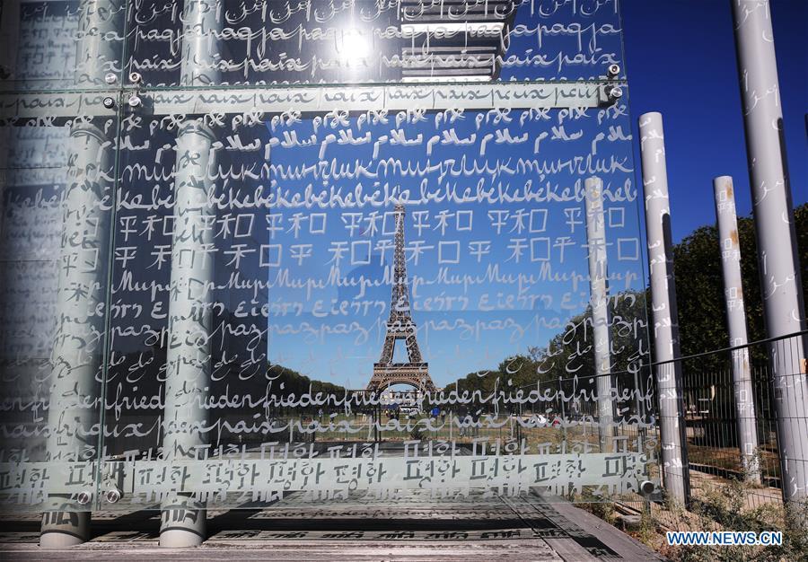 Photo taken on Sept. 19, 2019 shows the Wall for Peace beside Eiffel Tower in Paris, France. The word "PEACE" is engraved on it in 32 languages. (Xinhua/Gao Jing)