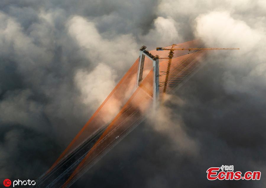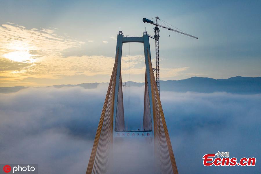 An aerial view of the Qujiang Bridge under construction and surrounded by fog in Guang’an City, Southwest China's Sichuan Province, Sept. 21, 2019. An important part of a highway linking Guang’an City with Huaying City, the bridge measures 670 meters long with a span of 280 meters and has six lanes in two directions. The bridge’s main tower is 151 meters tall. (Photo/IC)