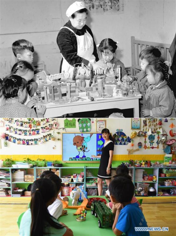 Top: File photo taken in the 1960s by Tian Ming shows a nursery worker taking care of children at a kindergarten in north China's Tianjin. Bottom: Photo taken on July 8, 2019 by Wang Kai shows Cao Feiran using an online multimedia education platform to teach children at a kindergarten in Jinan, east China's Shandong Province. In 1949 when the People's Republic of China was founded, the Chinese people faced a devastated country that needed to be rebuilt from scratch after decades of warfare and chaos. After decades of unremitting endeavors and dedication by the Chinese people, China has grown to be the world's second largest economy. In 1952, China's GDP was 30 billion U.S. dollars, while in 2018, its GDP reached 13.61 trillion U.S. dollars, an increase of 452.6 times. A group of combo photos give you a glimpse of what Chinese people did decades ago and what they do right now. Undoubtedly, people from all walks of life in China with hard work and wisdom have made contributions to the country's development. (Xinhua)