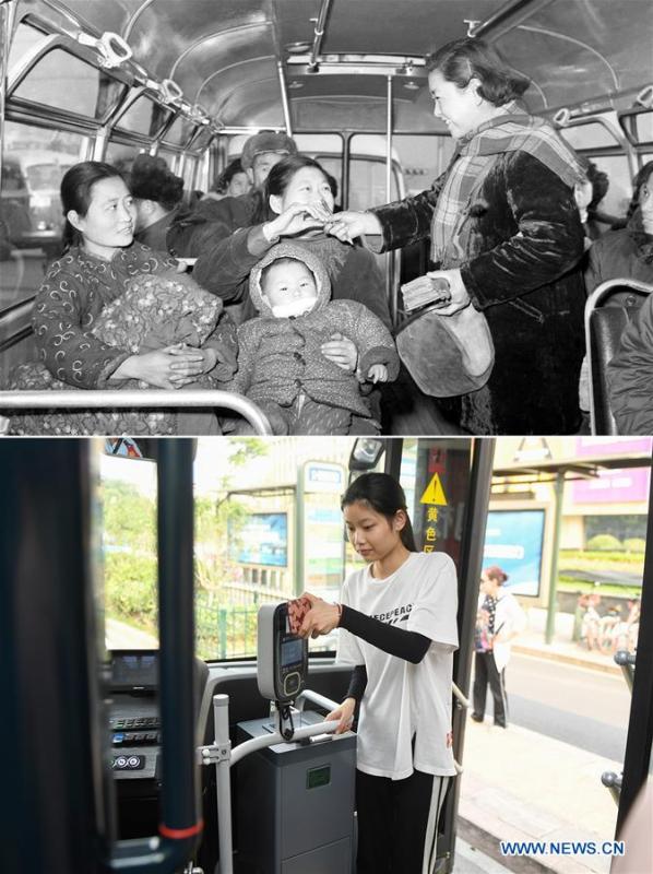 Top: File photo taken in 1960 by Huang Jingda shows bus conductor Shu Zhiying working on a bus in Beijing, capital of China. Bottom: Photo taken on June 27, 2019 by Huang Zongzhi shows a passenger paying for ticket via mobile payment in Hangzhou, capital of east China's Zhejiang Province. In many cities of China, the payment method of public transportation has progressed from cash, IC cards to today's QR code scanning. In 1949 when the People's Republic of China was founded, the Chinese people faced a devastated country that needed to be rebuilt from scratch after decades of warfare and chaos. After decades of unremitting endeavors and dedication by the Chinese people, China has grown to be the world's second largest economy. In 1952, China's GDP was 30 billion U.S. dollars, while in 2018, its GDP reached 13.61 trillion U.S. dollars, an increase of 452.6 times. A group of combo photos give you a glimpse of what Chinese people did decades ago and what they do right now. Undoubtedly, people from all walks of life in China with hard work and wisdom have made contributions to the country's development. (Xinhua)