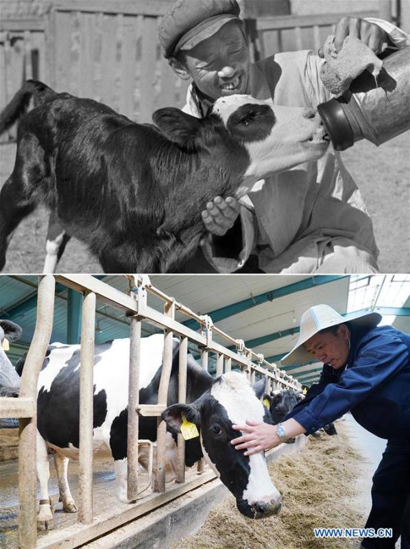 Top: File photo taken in 1962 by Hu Wei shows breeder Wang Decheng feeding a four-day-old calf at Xinghuo cattle farm in northeast China's Heilongjiang Province. Bottom: Photo taken on July 10, 2019 by Wang Jianwei shows Zhang Deyu working at a cowshed in a forest farm in Heilongjiang. In 1949 when the People's Republic of China was founded, the Chinese people faced a devastated country that needed to be rebuilt from scratch after decades of warfare and chaos. After decades of unremitting endeavors and dedication by the Chinese people, China has grown to be the world's second largest economy. In 1952, China's GDP was 30 billion U.S. dollars, while in 2018, its GDP reached 13.61 trillion U.S. dollars, an increase of 452.6 times. A group of combo photos give you a glimpse of what Chinese people did decades ago and what they do right now. Undoubtedly, people from all walks of life in China with hard work and wisdom have made contributions to the country's development. (Xinhua)