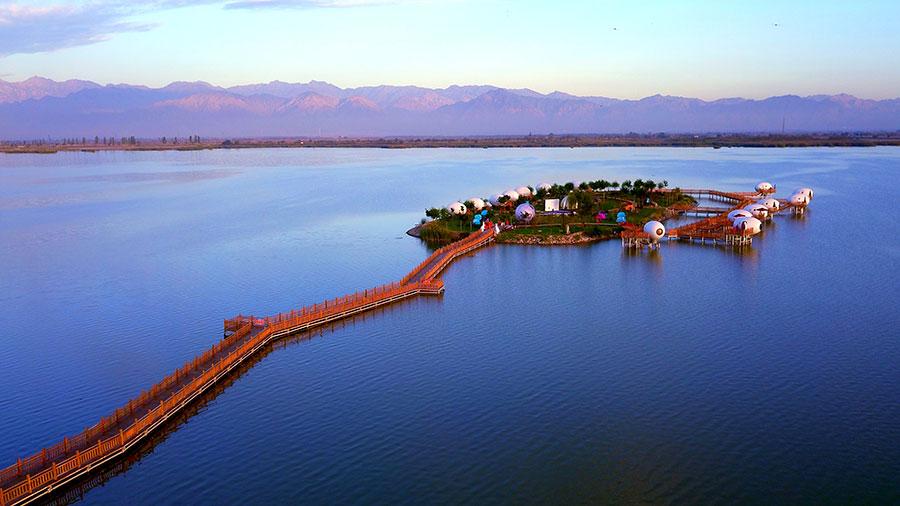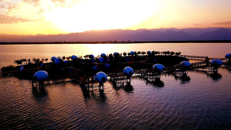 The Sand Lakes of the Ningxia Hui autonomous region, where desert and lake combine, is famous for the blended scenery of water township and desert. In the dim light of the evening, the "Egg Houses" and Sand Lakes make for a fantastic view. Helan Mountain in the distance and blue waters add radiance and beauty.