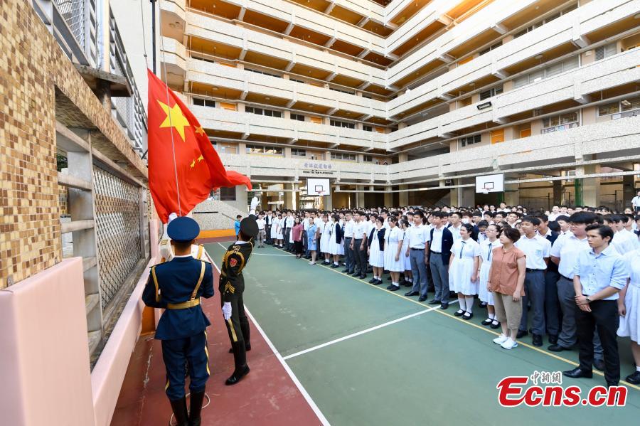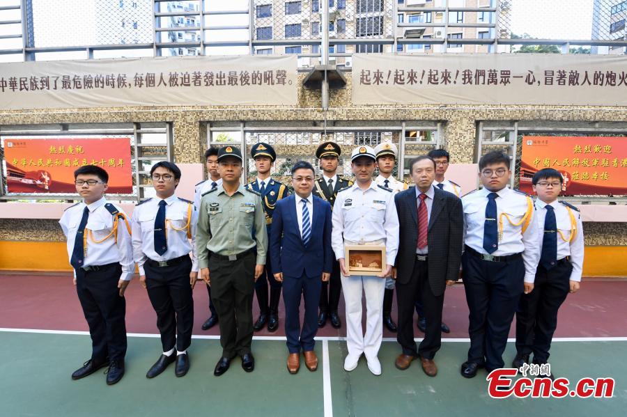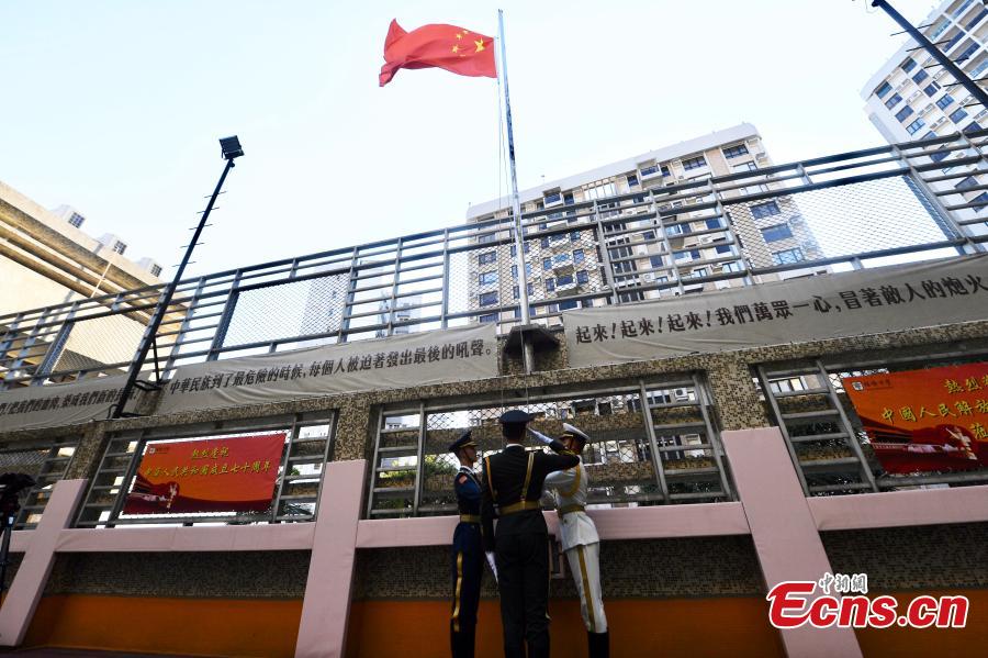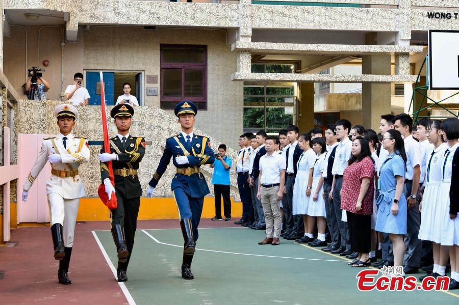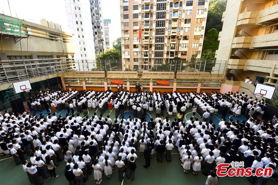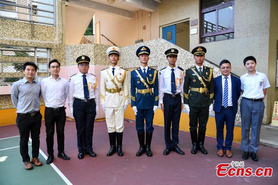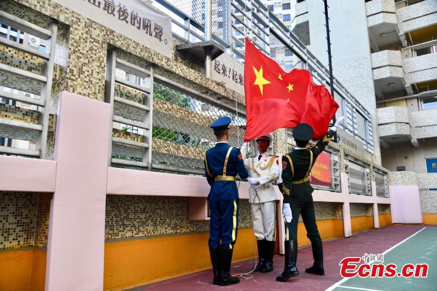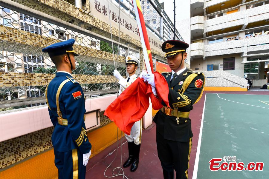 Honor guards from the Hong Kong Garrison of the Chinese People's Liberation Army hold a flag-raising ceremony at Pui Kiu Middle School, Sept. 23, 2019, ahead of the 70th anniversary of the founding of the People’s Republic of China. (Photo: China News Service/Li Zhihua)