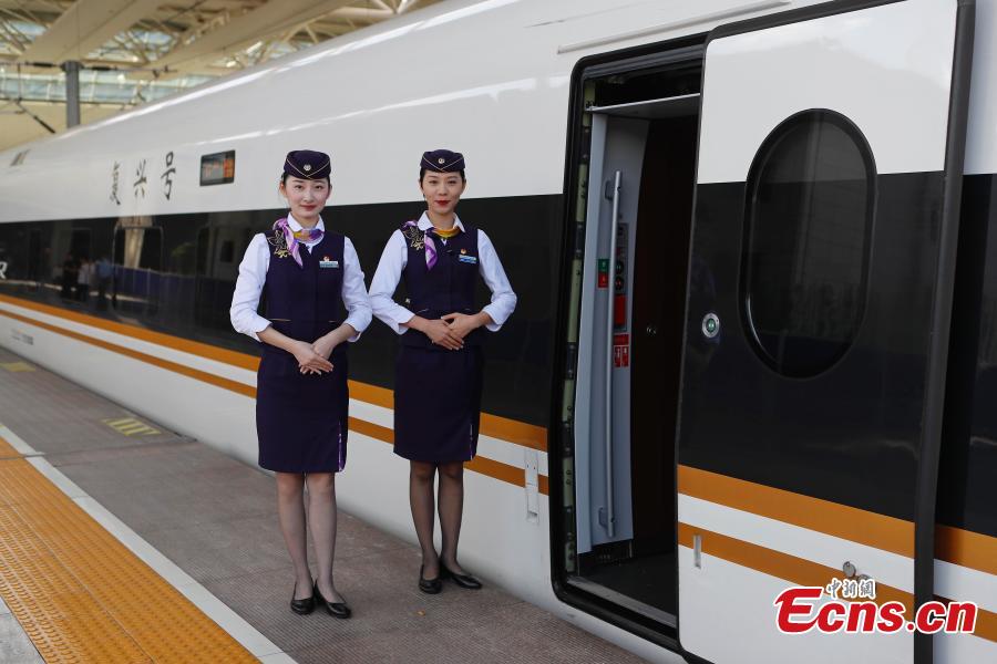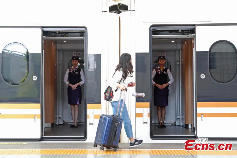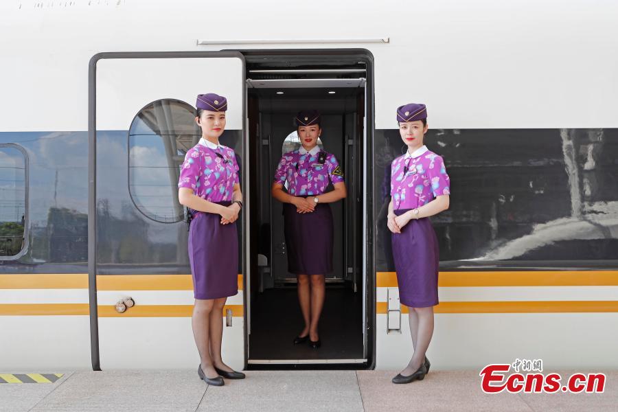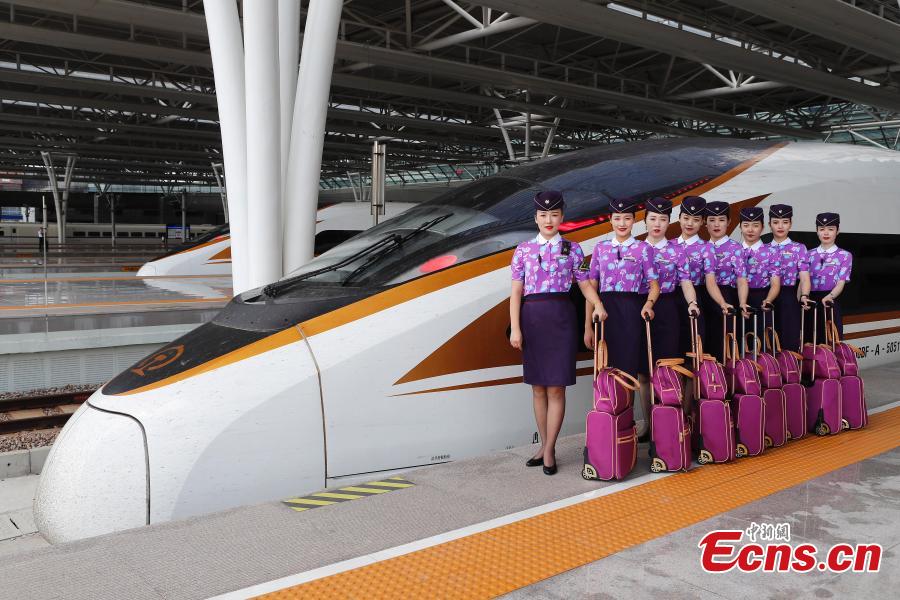 High-speed train attendants of the China Railway Shanghai Group wear new uniforms, rolled out to celebrate the 70th anniversary of the founding of the People’s Republic of China, Sept. 23, 2019. The new uniform features cultural elements of Shanghai. (Photo: China News Service/Yin Liqin)