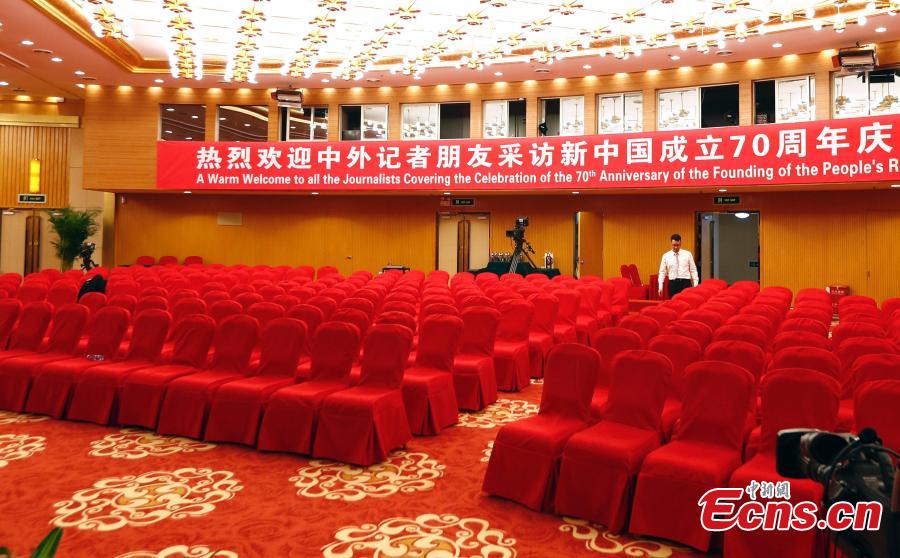 A studio at the press center for the 70th anniversary of the founding of the People’s Republic of China in Beijing, Sept. 23, 2019. Decorated overwhelming in red, the press center has many facilities and zones to aid media coverage of the commemorations. (Photo: China News Service/Huang Yuqin )