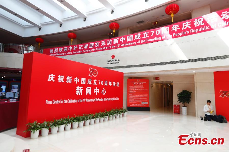 The press center for the 70th anniversary of the founding of the People’s Republic of China opens in Beijing, Sept. 23, 2019. Decorated overwhelming in red, the press center has many facilities and zones to aid media coverage of the commemorations. (Photo: China News Service/Huang Yuqin )