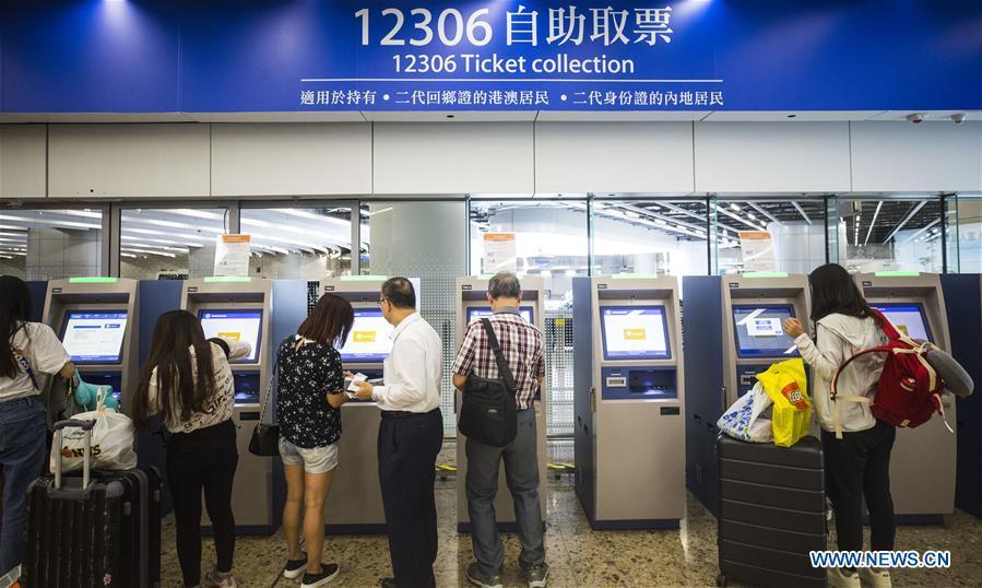 Passengers get tickets from self-service machines at West Kowloon Station in Hong Kong, south China, Sept. 23, 2019. Monday marked the first anniversary of the launch of Hong Kong section of Guangzhou-Shenzhen-Hong Kong Express Rail Link. (Xinhua/Lu Ye)