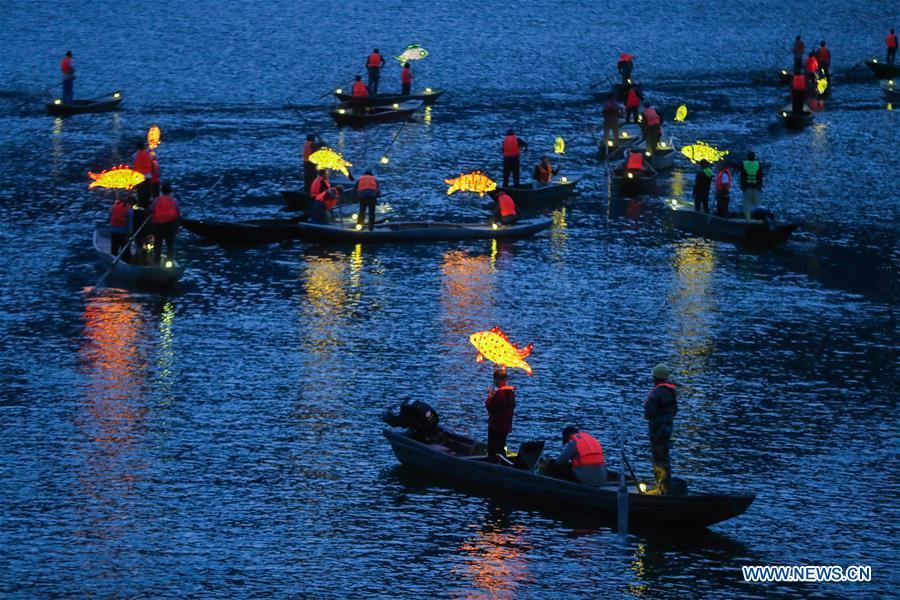 Fishermen row fishing boats in Songcun Township of Chun'an County, Hangzhou, east China's Zhejiang Province, Sept. 25, 2019. In recent years, Songcun made great efforts to develop rural tourism to promote its beautiful landscape and fishing culture. From January to July this year, the township has received 100,000 tourists, and tourism revenue during the period reached 13 million yuan (about 1.8 million U.S. dollars). (Xinhua/Xu Yu)