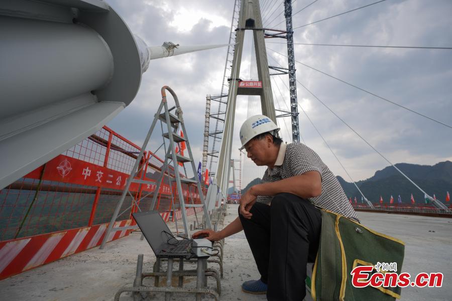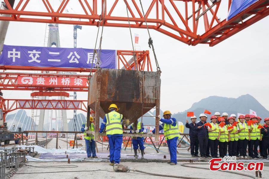 Aerial photo taken on Sept. 21, 2019 shows the Pingtang Bridge under construction in Southwest China's Guizhou Province. Located in Qiannan Buyei and Miao Autonomous Prefecture, the colossal cable-supported viaduct with a span of 2,135 meters will serve as a major connection on the Pingtang-Luodian Expressway above Caodu River Canyon. At 332 meters high, the diamond-shaped main support is the world's tallest reinforced concrete bridge tower. Construction work on placement of concrete for the bridge was completed on Thursday. (Photo: China News Service/He Junyi)