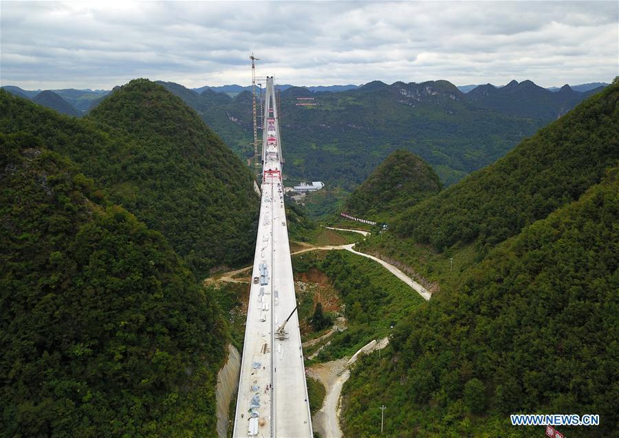 Photo taken on Sept. 26, 2019 shows a concrete tower of Pingtang Bridge in southwest China's Guizhou Province. Pingtang Bridge completed its closure on Thursday. The bridge, a colossal cable-supported viaduct with a span of 2,135 meters, will serve as a major connection on the Pingtang-Luodian Expressway above the Caodu River Canyon. The bridge will be completed and open to traffic by the end of 2019, shortening the travel time between Pingtang and Luodian from two and a half hours to around one hour. (Xinhua/Yang Wenbin)