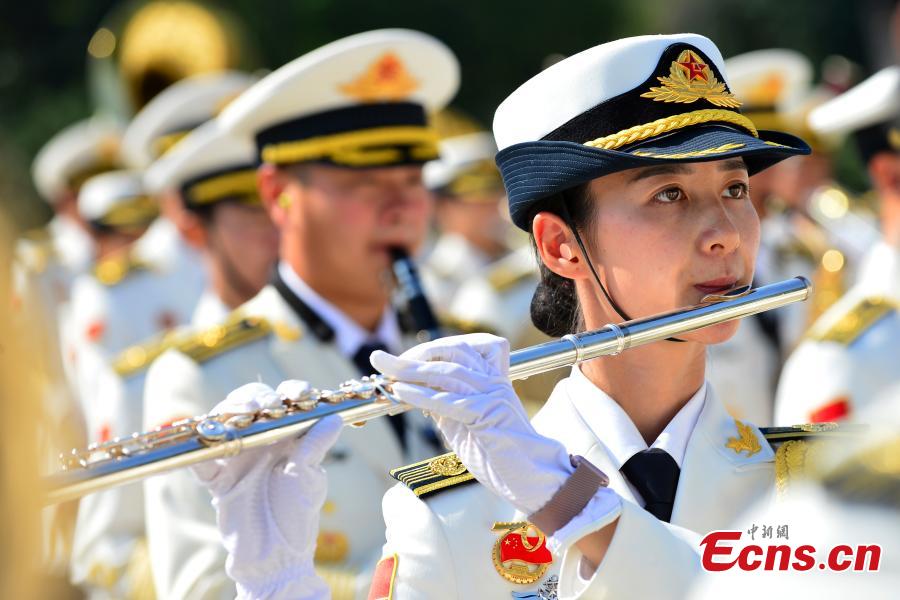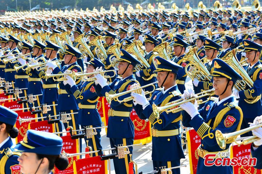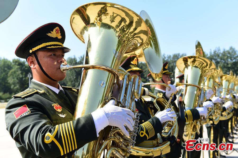 A Chinese military band rehearses for the military parade to be held in Beijing for the National Day celebrations on Oct. 1, 2019. Some 15,000 military personnel will take part in the parade, the largest in recent years. A total of 59 formations, a military band, more than 160 aircraft and 580 pieces of equipment will also be part of the parade. The military band includes more than 1,000 members from different sections of the PLA and will need to be able to play for approximately four hours during the parade. (Photo: China News Service/Sun Xiaomeng)