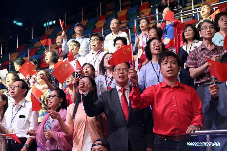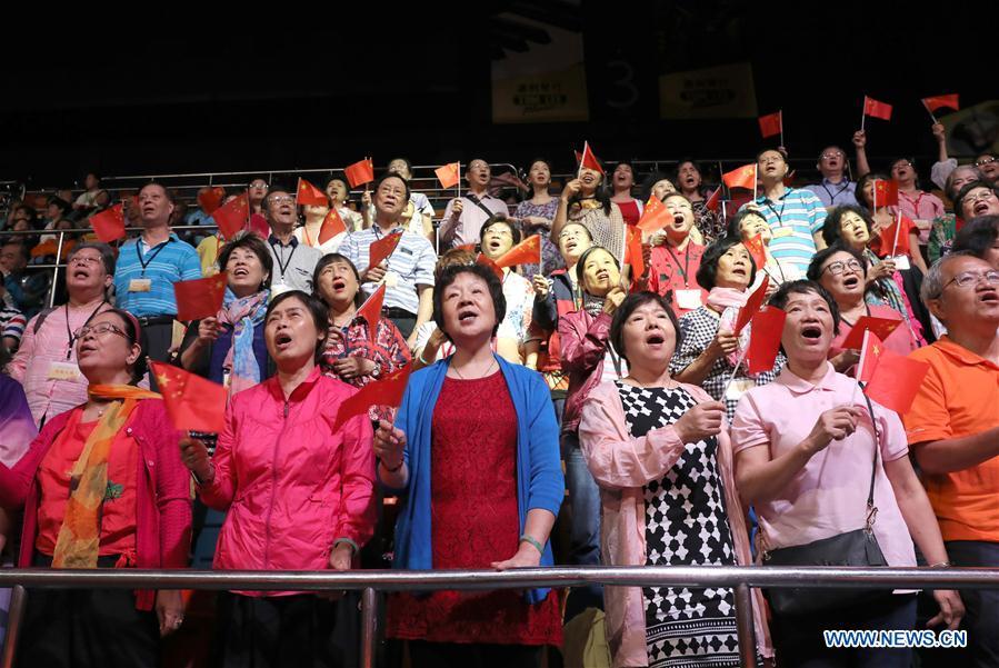 Audience sing the song "Me and My Motherland" together with the performers on stage during a gala in celebration of the 70th anniversary of the founding of the People's Republic of China (PRC) held in Hong Kong, south China, Sept. 28, 2019. (Xinhua/Wu Xiaochu)