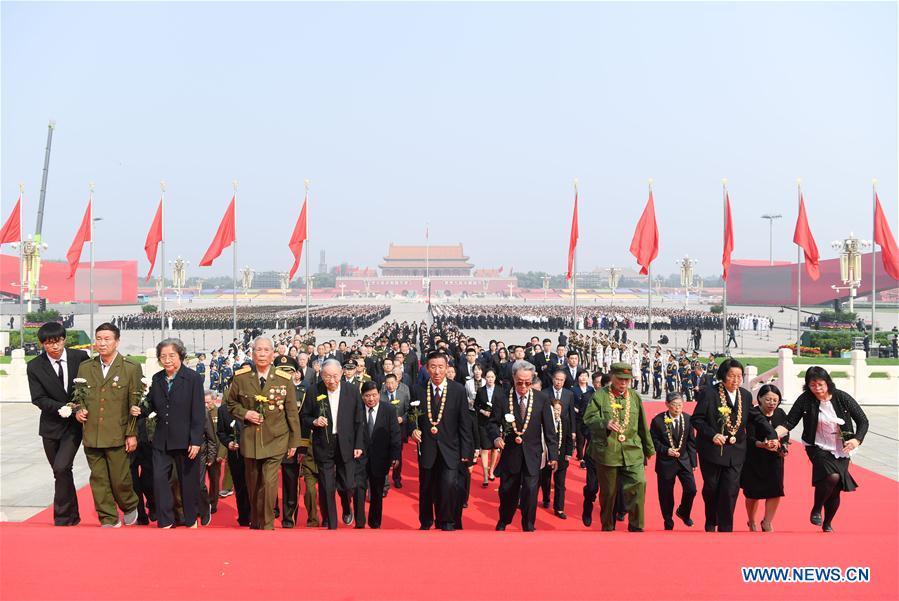 A ceremony presenting flower baskets to deceased national heroes on the Martyrs' Day is held at Tian'anmen Square in Beijing, capital of China, on Sept. 30, 2019. (Xinhua/Yin Bogu)