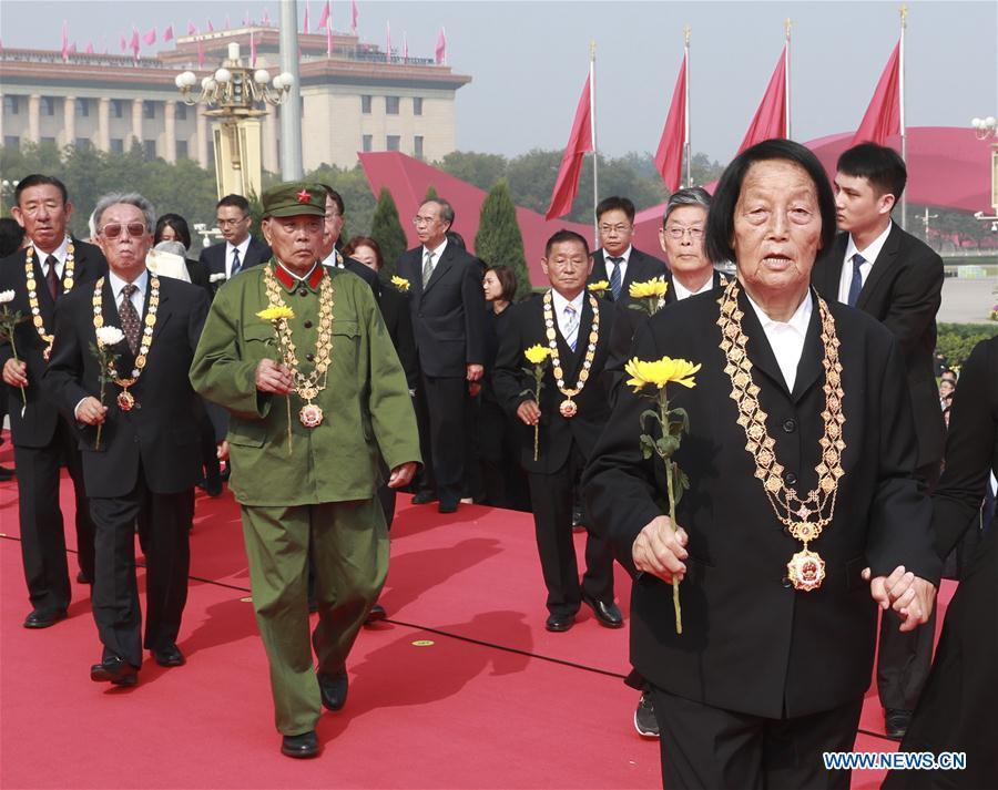 A ceremony presenting flower baskets to deceased national heroes on the Martyrs' Day is held at Tian'anmen Square in Beijing, capital of China, on Sept. 30, 2019. (Xinhua/Liu Bin)