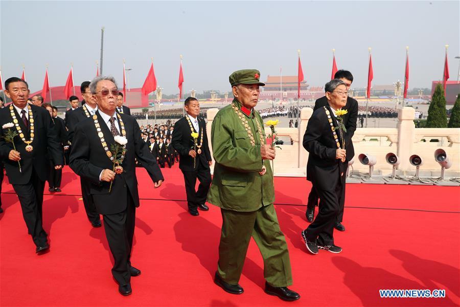 A ceremony presenting flower baskets to deceased national heroes on the Martyrs' Day is held at Tian'anmen Square in Beijing, capital of China, on Sept. 30, 2019. (Xinhua/Pang Xinglei)