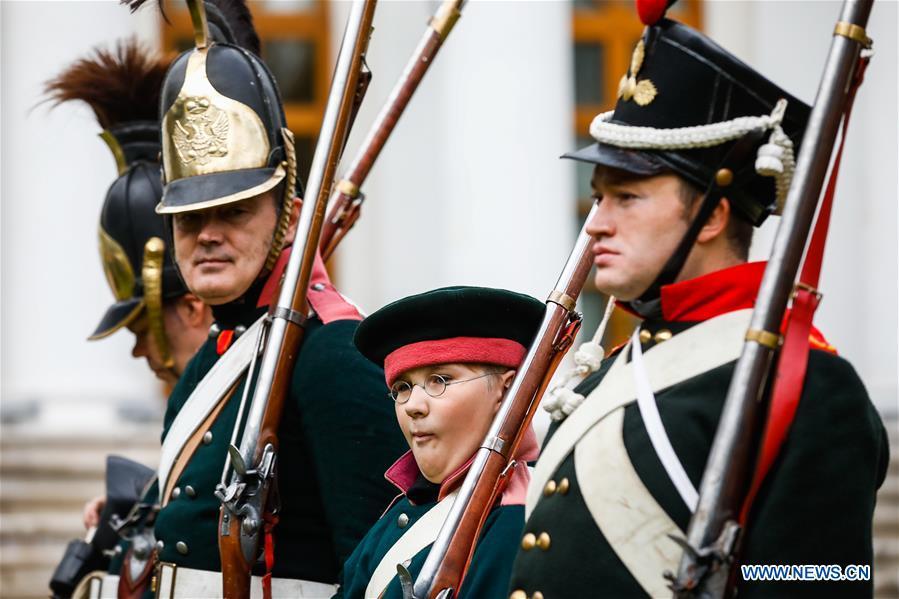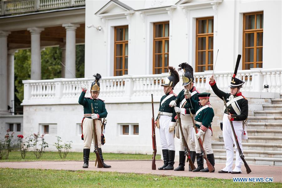 People wearing Russian 19th century military costumes participate in the "War And Peace" festival held in Ostafievo manor on the far outskirts of Moscow, Russia, Sept. 28, 2019. The idea of this festival was to recreate the atmosphere of the first half of 19th century in Russia. The name of the festival refers to the book "War and Peace" by Lev Tolstoy that described this period of Russian history. (Photo by Maxim Chernavsky/Xinhua)