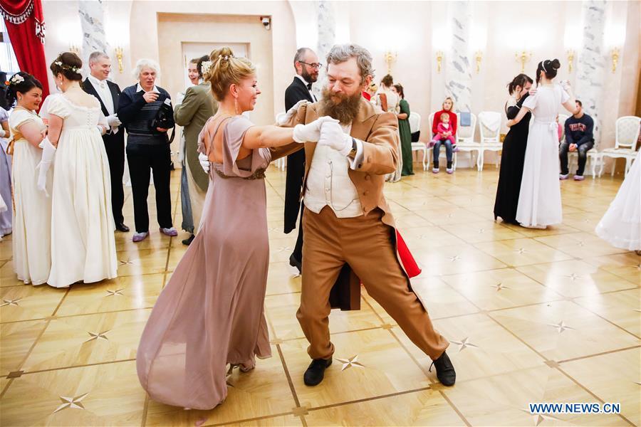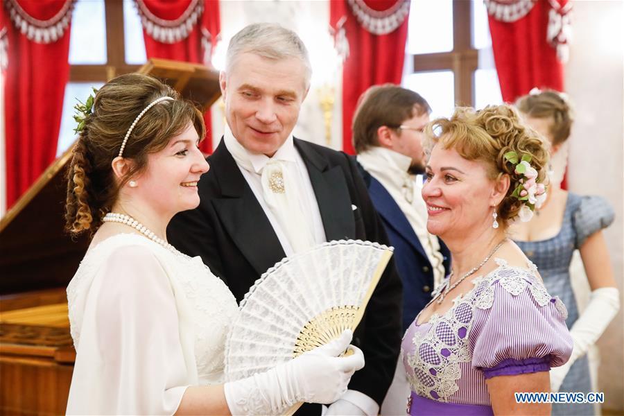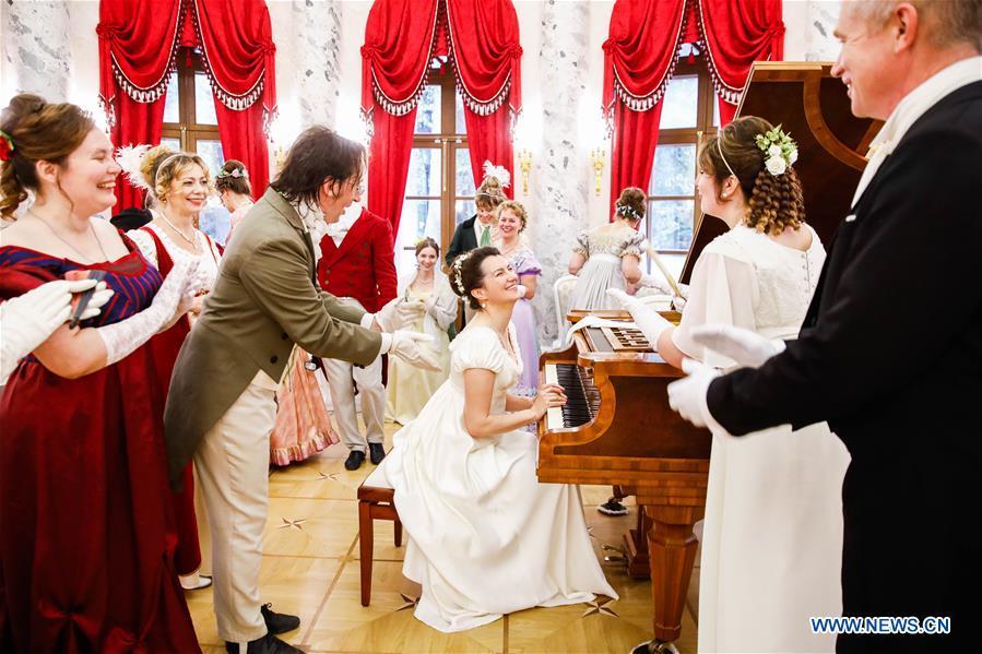 People wearing Russian 19th century costumes participate in a ball during the "War And Peace" festival held in Ostafievo manor on the far outskirts of Moscow, Russia, Sept. 28, 2019. The idea of this festival was to recreate the atmosphere of the first half of 19th century in Russia. The name of the festival refers to the book "War and Peace" by Lev Tolstoy that described this period of Russian history. (Photo by Maxim Chernavsky/Xinhua)