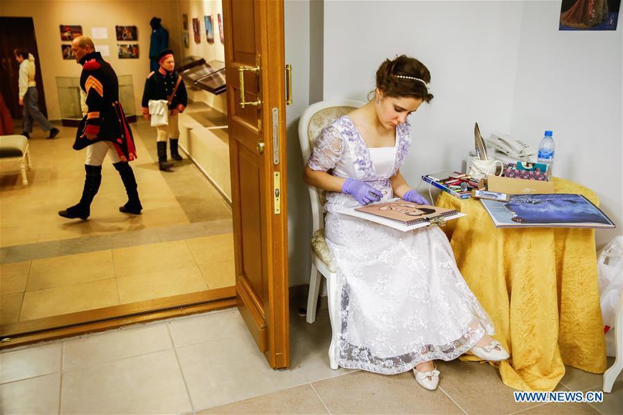 A woman wearing a Russian 19th century costume draws a portrait during the "War And Peace" festival held in Ostafievo manor on the far outskirts of Moscow, Russia, Sept. 28, 2019. The idea of this festival was to recreate the atmosphere of the first half of 19th century in Russia. The name of the festival refers to the book "War and Peace" by Lev Tolstoy that described this period of Russian history. (Photo by Maxim Chernavsky/Xinhua)
