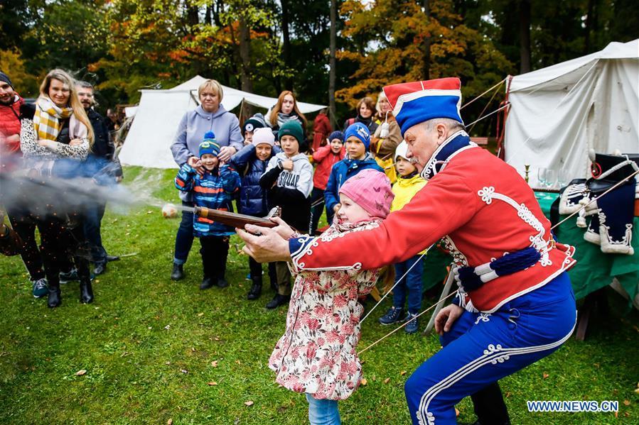 A child tries firing a 19th century pistol during the "War And Peace" festival held in Ostafievo manor on the far outskirts of Moscow, Russia, Sept. 28, 2019. The idea of this festival was to recreate the atmosphere of the first half of 19th century in Russia. The name of the festival refers to the book "War and Peace" by Lev Tolstoy that described this period of Russian history. (Photo by Maxim Chernavsky/Xinhua)
