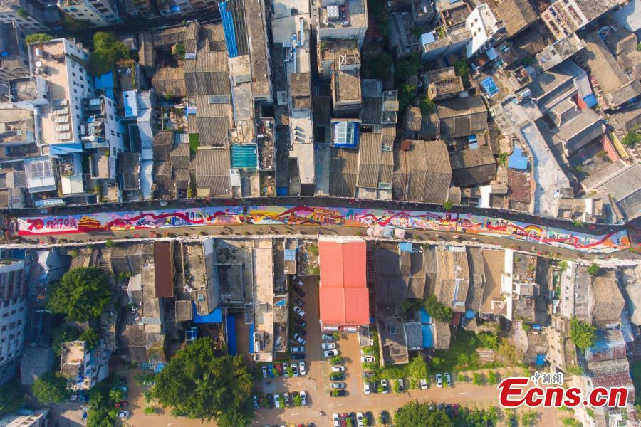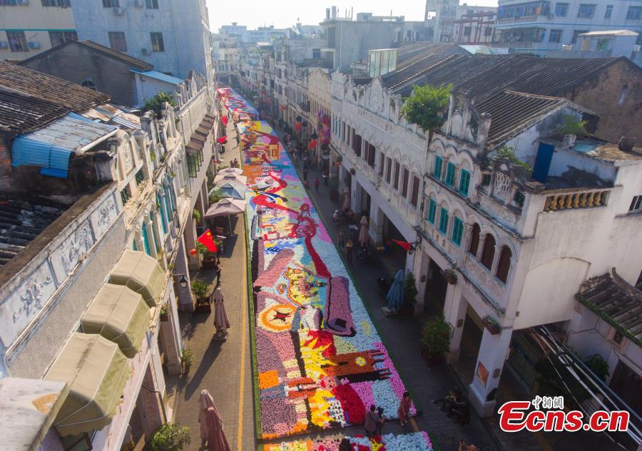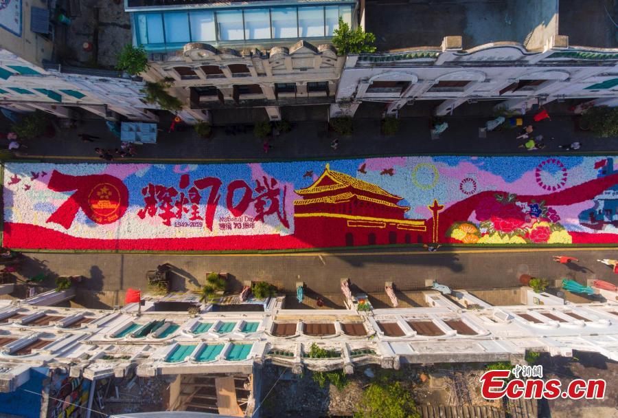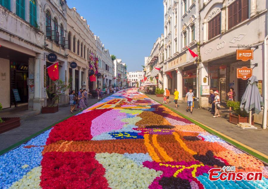 A 210-meter-long floral display celebrating the 70th anniversary of the founding of the People’s Republic of China on Qilou Old Street (Arcade Street) in Haikou City, Hainan Province, Sept. 30, 2019. (Photo: China News Service/Luo Yunfei)