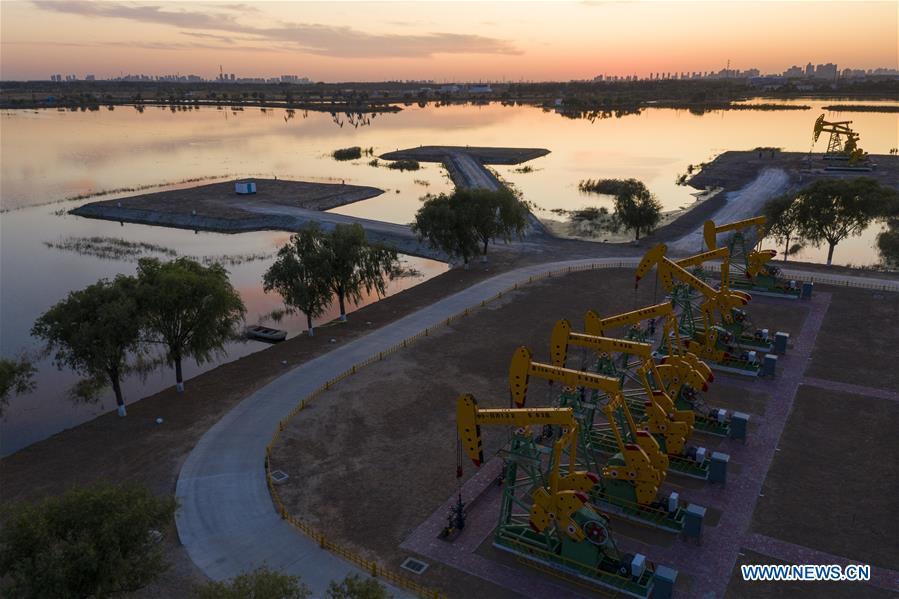 Aerial photo taken on Sept. 27, 2019 shows sunset scenery at Daqing Oilfield in Daqing, northeast China's Heilongjiang Province. Daqing Oilfield, discovered on Sept. 26, 1959, is the largest oilfield run by PetroChina and also the country's largest oil production base. The oilfield, once accounting for over half of China's total crude output, had an annual crude production of over 50 million tonnes for 27 consecutive years and over 40 million tonnes for 12 straight years. Its annual crude oil and gas output still remains over 40 million tonnes of oil equivalent, with proven oil reserves at 6.48 billion tonnes. Its annual natural gas output has exceeded 4 billion cubic meters. (Xinhua/Xie Jianfei)
