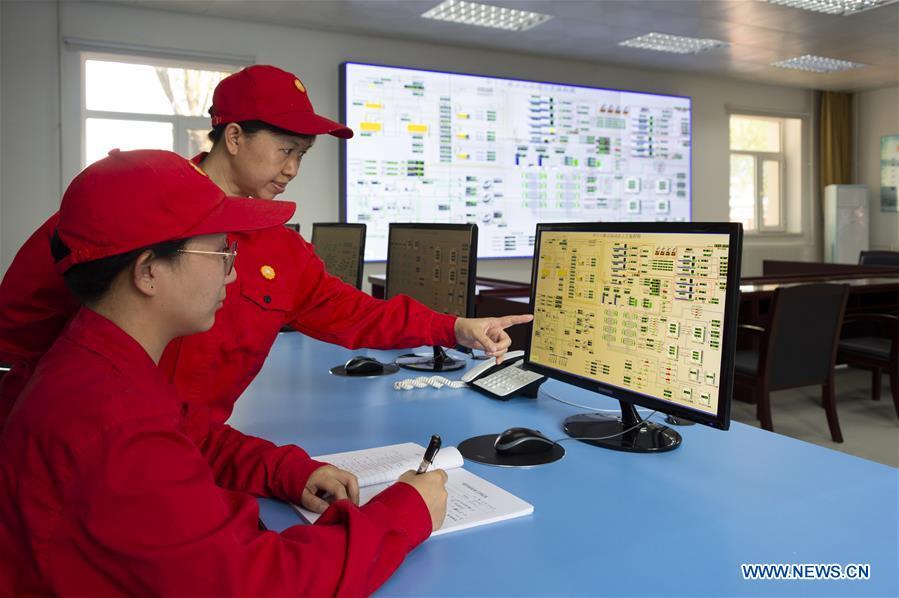 Staff members work at Daqing Oilfield in Daqing, northeast China's Heilongjiang Province, Sept. 28, 2019. Daqing Oilfield, discovered on Sept. 26, 1959, is the largest oilfield run by PetroChina and also the country's largest oil production base. The oilfield, once accounting for over half of China's total crude output, had an annual crude production of over 50 million tonnes for 27 consecutive years and over 40 million tonnes for 12 straight years. Its annual crude oil and gas output still remains over 40 million tonnes of oil equivalent, with proven oil reserves at 6.48 billion tonnes. Its annual natural gas output has exceeded 4 billion cubic meters. (Xinhua/Xie Jianfei)