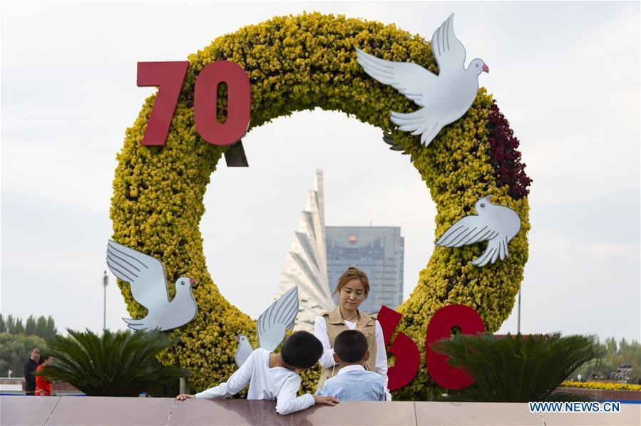 A mother and her children pose for a group photo at the Iron Man Square in Daqing, northeast China's Heilongjiang Province, Sept. 28, 2019. Daqing Oilfield, discovered on Sept. 26, 1959, is the largest oilfield run by PetroChina and also the country's largest oil production base. The oilfield, once accounting for over half of China's total crude output, had an annual crude production of over 50 million tonnes for 27 consecutive years and over 40 million tonnes for 12 straight years. Its annual crude oil and gas output still remains over 40 million tonnes of oil equivalent, with proven oil reserves at 6.48 billion tonnes. Its annual natural gas output has exceeded 4 billion cubic meters. (Xinhua/Xie Jianfei)