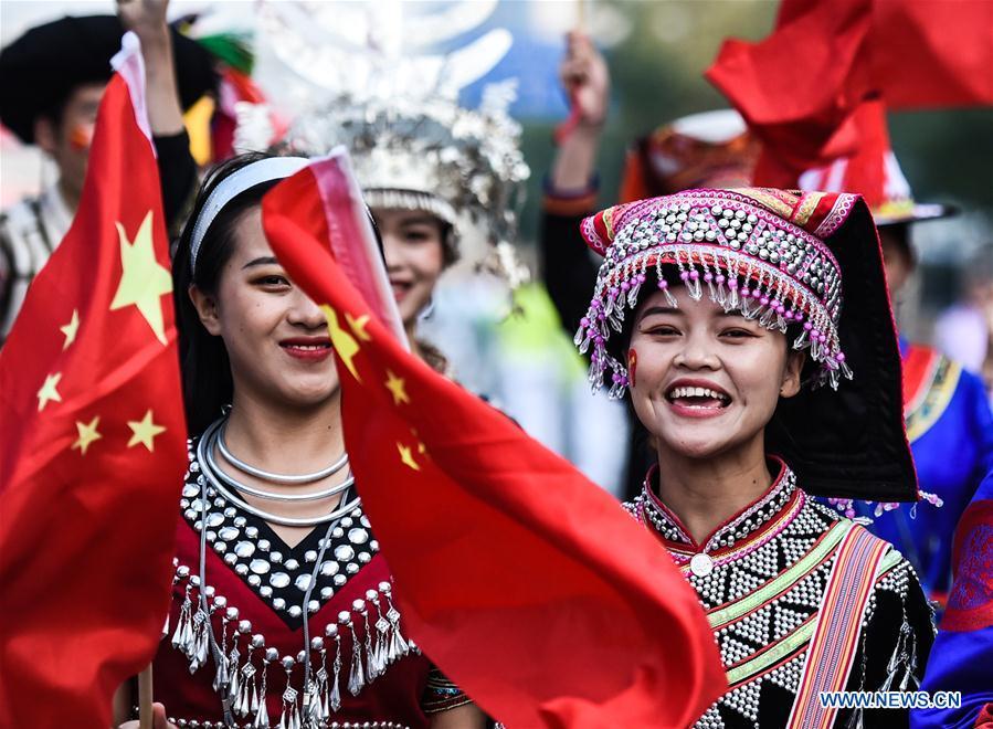 Attendees wave Chinese national flags ahead of celebrations marking the 70th anniversary of the founding of the People's Republic of China (PRC) in Beijing, capital of China, Oct. 1, 2019. (Xinhua/Tao Liang)