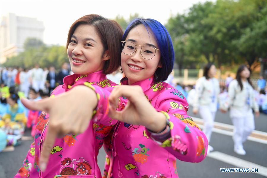 Attendees pose for photos ahead of celebrations marking the 70th anniversary of the founding of the People's Republic of China (PRC) in Beijing, capital of China, Oct. 1, 2019. (Xinhua/Tao Liang)