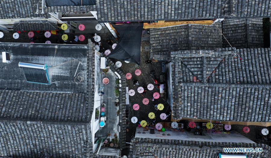 Aerial photo shows people visiting the Longmen ancient town at Fuyang District in Hangzhou, east China's Zhejiang Province, on Oct. 2, 2019, the second day of the 7-day-long National Day holiday. (Xinhua/Xu Yu)