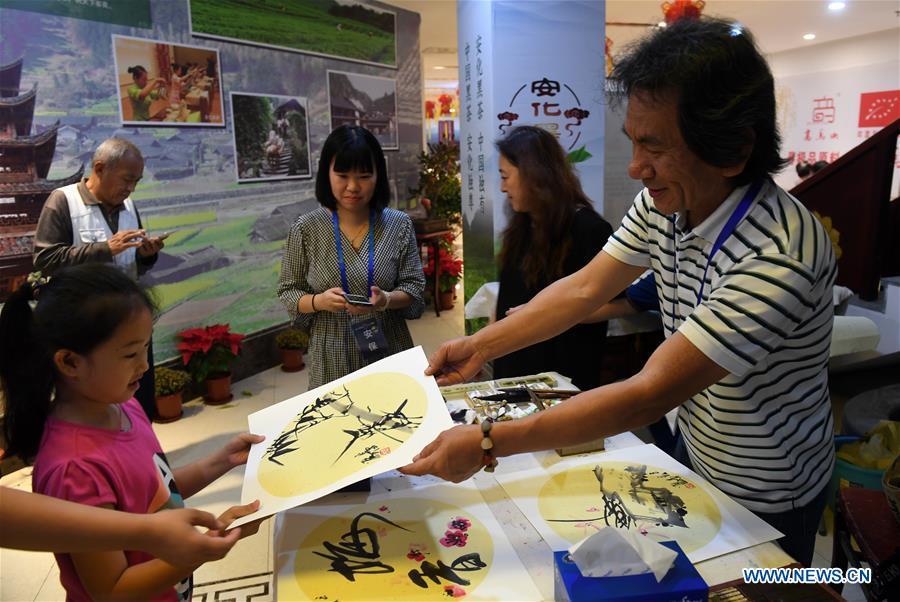 A painter gives his work to a girl during a Chinese calligraphy promotional activity at Badachu Park in Beijing, capital of China, Oct. 2, 2019. Many patriotic activities are held here during the National Day holiday from Oct. 1 to 7. (Xinhua/Li Jundong)