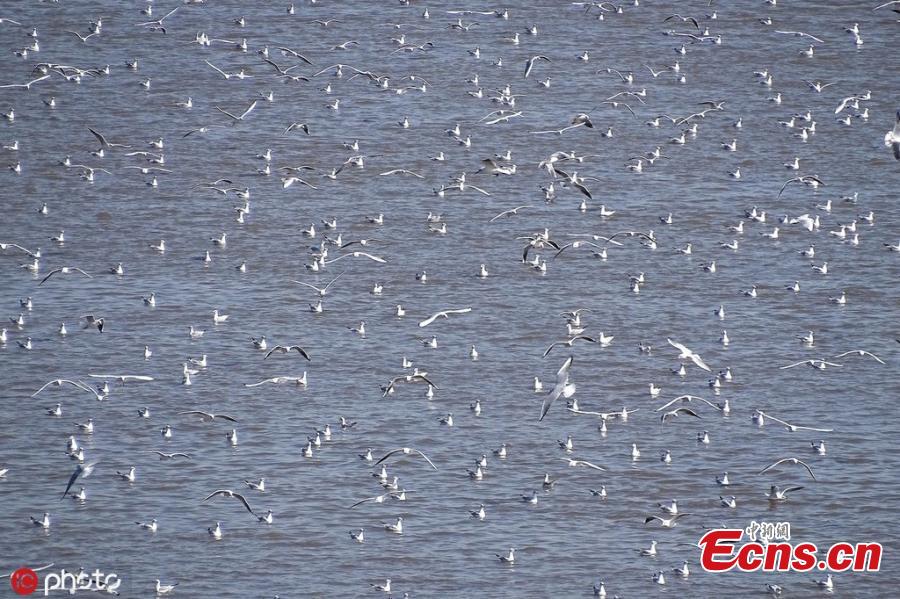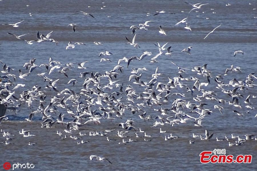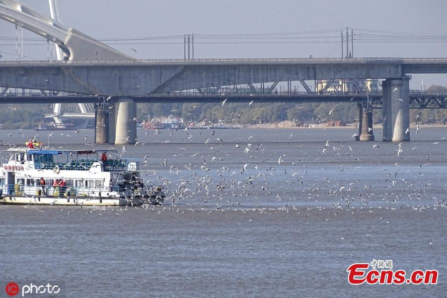 Migratory birds fly over the Songhua River in Harbin City, Northeast China’s Heilongjiang Province, Oct. 7, 2019. The Harbin section of the river is an important refuelling stop for birds during their migration to southern China. (Photo/IC)
