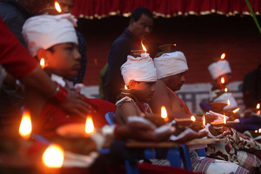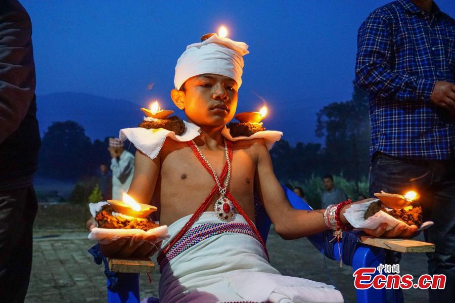 A boy stays with oil lamps on his head and hands while offering prayers to Goddess Durga on Bijaya Dashami, the tenth day of the Dashain Festival which celebrates the victory of good over evil, at Bhramayani temple in Bhaktapur, Nepal, Oct. 8, 2019.(Photo/China news service)