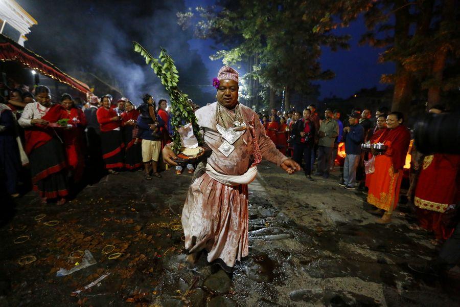 A priest performs a ritual during the tenth day Dashami of Dashain Festival at Brahmayani Temple in Bhaktapur, Nepal, Oct. 8, 2019. (Xinhua/ Sulav Shrestha)