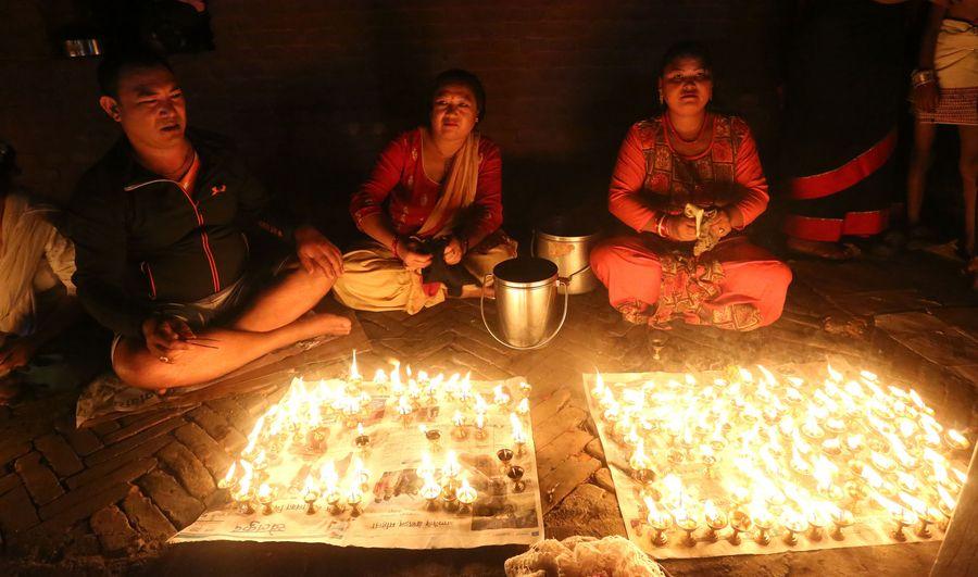 People light oil lamps while offering prayers to Goddess Durga as part of a religious ritual during Bijaya Dashami, Oct. 8, 2019. (Xinhua/Sunil Sharma)