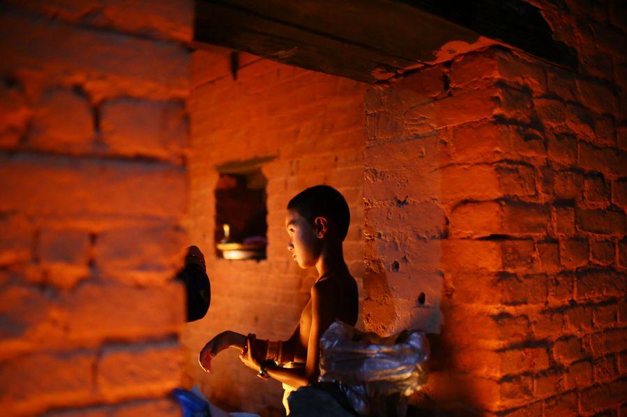A young Hindu devotee is about to take part in ritual prayer on Bijaya Dashami, Oct. 8, 2019. (Photo by Sulav Shrestha/Xinhua)