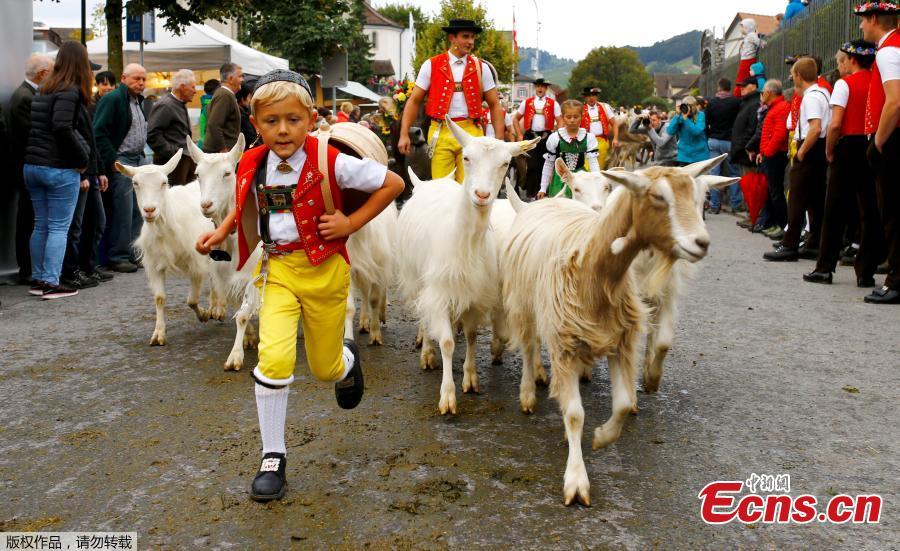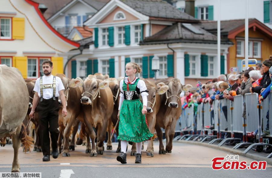 People watch farmers and their children wearing traditional costumes as they lead their cows and goats to the cattle market in Appenzell, Switzerland, October 8, 2019. (Photo/Agencies)