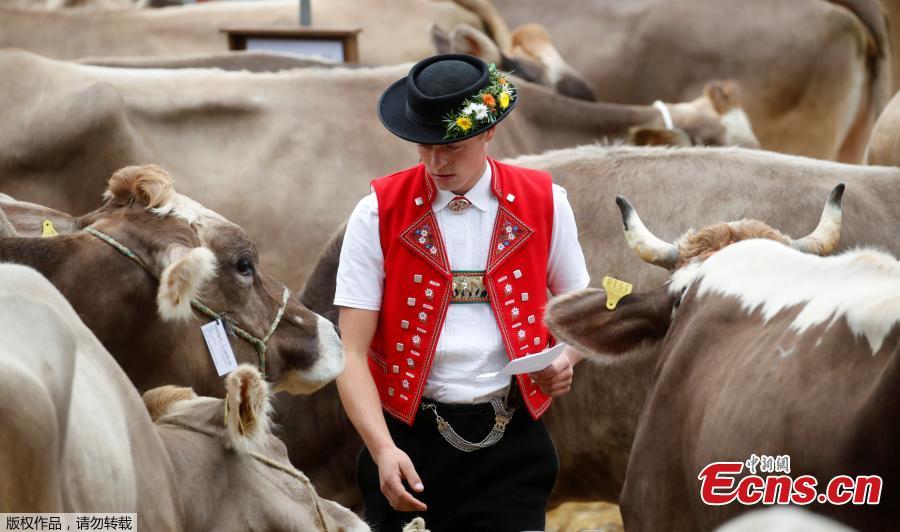 A farmer wears a traditional costume during the cattle market in Appenzell, Switzerland, October 8, 2019. (Photo/Agencies)