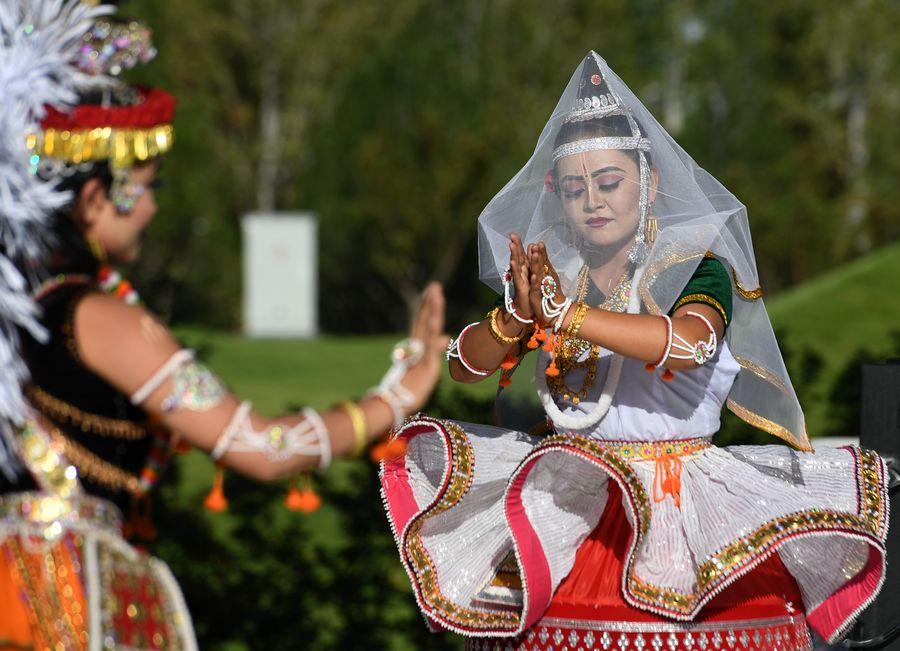 Staff members perform during the "India Day" event at the Beijing International Horticultural Exhibition in Beijing, capital of China, Aug. 17, 2019. (Xinhua/Zhang Chenlin)
