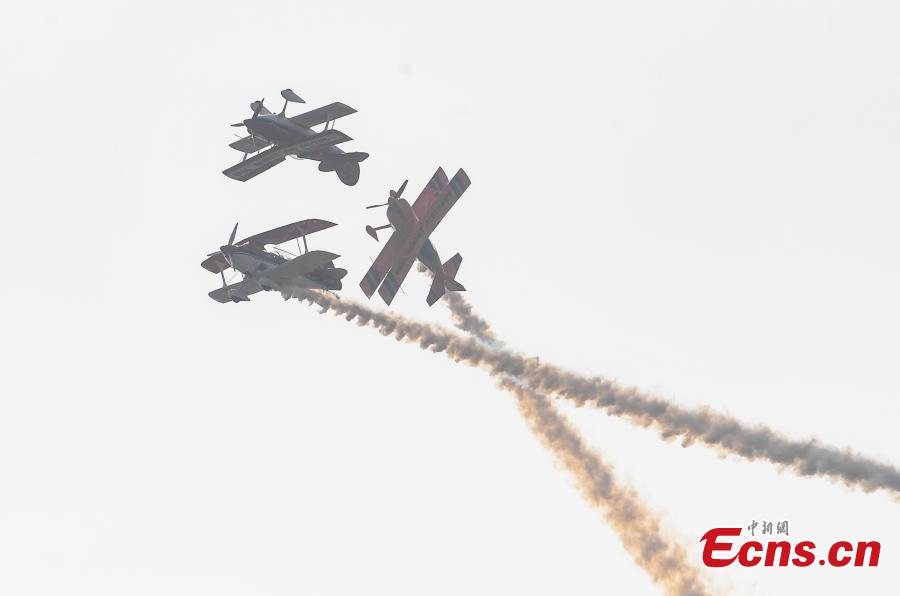 A view of aerobatic show by teams from many countries during the Yaocheng (Taiyuan) International General Aviation Convention 2019 in Taiyuan City, North China's Shanxi Province, Oct. 11, 2019. The convention from Oct. 10 to 13 includes forums, investment promotion activities and exhibitions. (Photo: China News Service/Wu Junjie)
